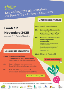 Nous avons le plaisir de vous inviter le 17 novembre 2025 pour un événement autour des solidarités alimentaires en Presqu’île-Brière-Estuaires, organisé dans le cadre du projet Mieux Manger Pour Tous.